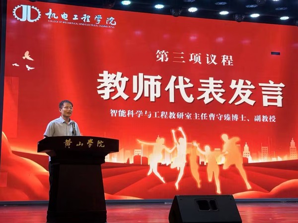 教师代表曹守臻副教授的致辞,为新生们打开了一扇领略机电学科魅力的窗口。他结合团队科研攻关的鲜活案例,生动阐述:“课堂上的理论知识,是绘制未来智能工厂的蓝图;实验室里的每一行代码,都是赋予智能装备灵魂的关键。” 曹守臻鼓励新生永葆好奇心,积极参与实验与科研项目,在思想碰撞中激发创新火花,为成长为优秀工程师筑牢根基。