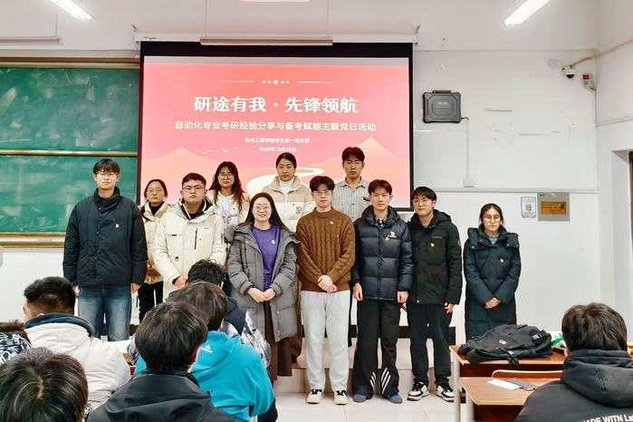 为深入学习贯彻习近平新时代中国特色社会主义思想和党的二十届四中全会精神,充分发挥学生党支部战斗堡垒作用和党员先锋模范作用,12月29日晚,机电工程学院学生第一党支部在文端楼举办“研途有我·先锋领航”自动化专业考研经验分享与备考赋能主题党日活动。